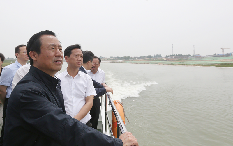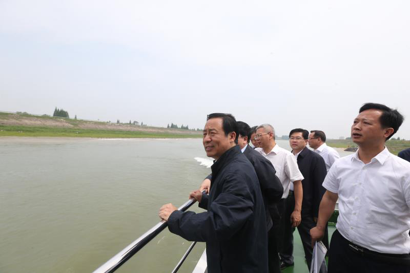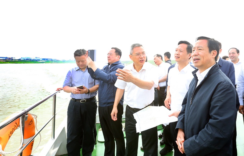许达哲与各位河长一起伫立船头巡河,比对洞庭湖区水利工程图,现场查看湘江、资江河流整治情况。详细了解安全防汛及江岸整治采砂和生态复绿等情况。