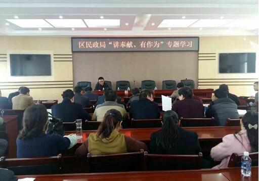 日前,区民政局组织全体党员及乡镇场民政专干共计80余人在区政府信息中心会议室进行“讲奉献、有作为”专题学习讨论。