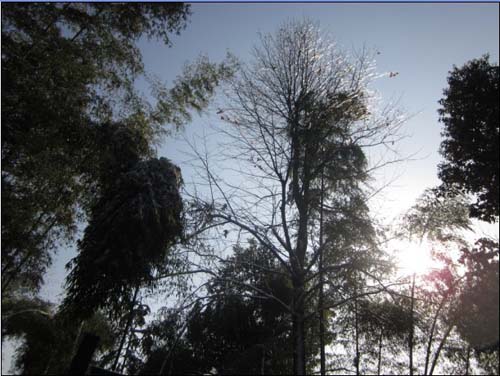 雪过天晴,毫无疑问,你将遭遇一场感官的盛宴。当阳光缓缓升起,将已落叶的红枫树枝上结成的冰凌照得晶莹剔透、五彩斑斓时,林中开始响起珍珠般清脆的轻音乐,那是雪粒在轻轻滑落,不小心它会钻进你的脖子,像一只只人丹幻化成的虫子在轻轻的咬着你,痒痒的,柔柔的,似凉非凉,似麻非麻。太阳渐渐升高,雪粒变成了水珠,再后就是成团的雪球滚落,在你的摄影镜头里,投上一层迷幻的色彩。