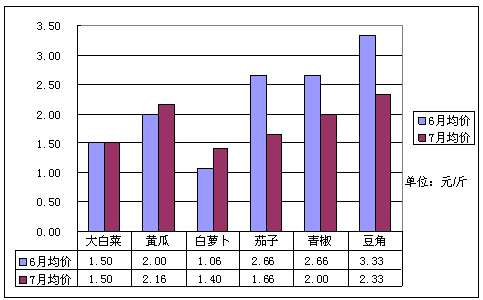 1、蔬菜价格。我市大白菜、黄瓜、白萝卜、茄子、青椒、豆角超市、集市混合均价每斤分别为1.5元、2.16元、1.4元、1.66元、2元、2.33元,黄瓜、白萝卜、青椒、豆角同比分别上涨11.92%、23.89%、11.11%、20.73%,茄子、青椒、豆角环比分别下跌37.59%、24.81%、30.03%,黄瓜、白萝卜环比分别上涨8%、32.08%。和上月相比,我市经历了大雨天气,影响本地菜上市量,部分蔬菜价格上涨,而外地湖北高山大白菜、白萝卜、卷心菜,云南的叶类菜存在较大供求空间,价格会略有上升。